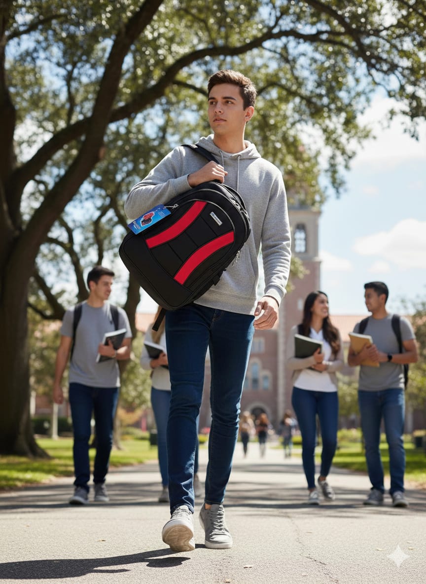 • Multiple Spacious Compartments – Organize books, laptop, stationery, chargers, and accessories easily.