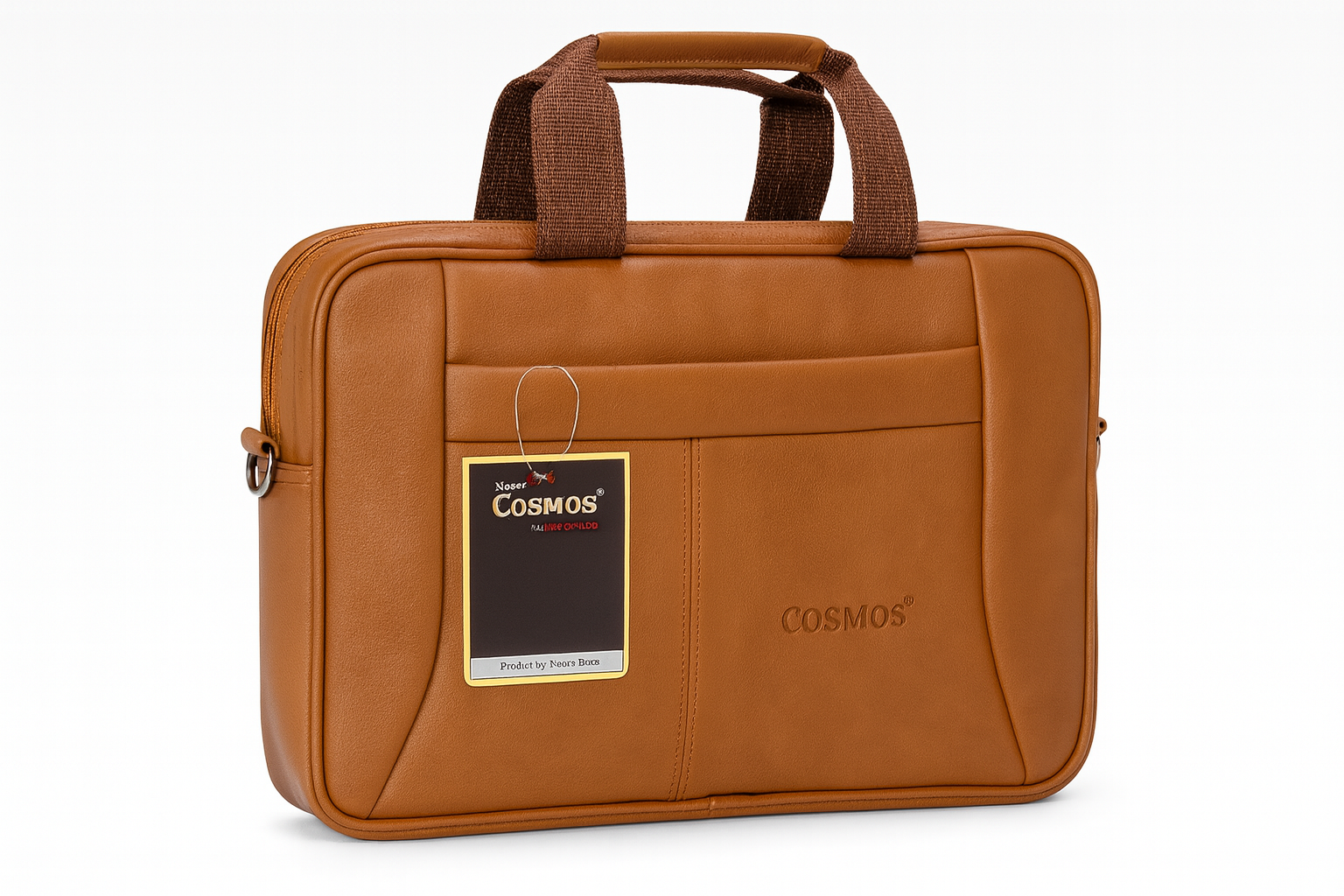 The COSMOS® Premium Office Laptop Bag features a stylish tan synthetic leather design with a padded compartment for laptops and documents. It includes a front utility pocket for quick-access essentials, durable dual handles, and high-quality stitching—perfect for office use, business travel, and daily commuting