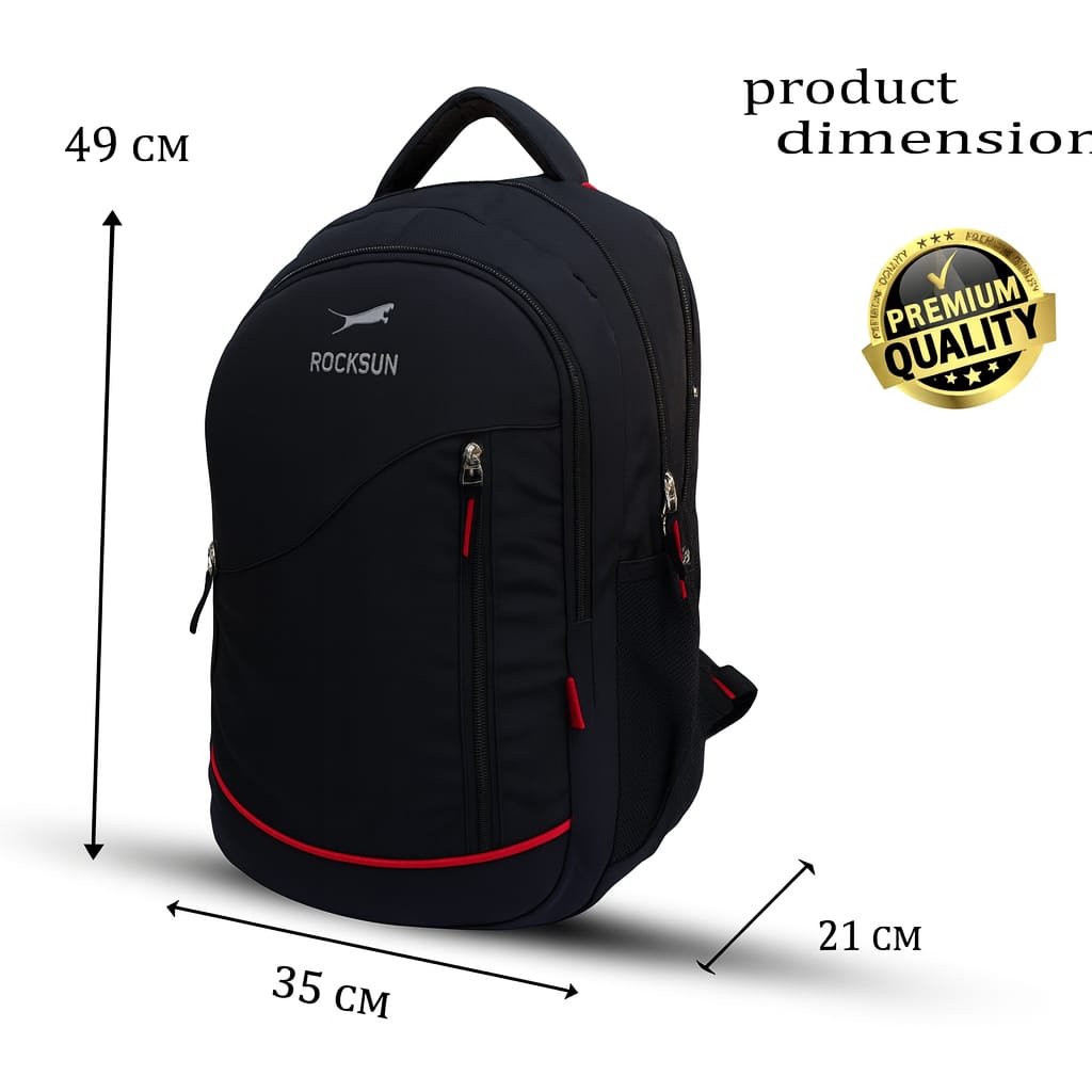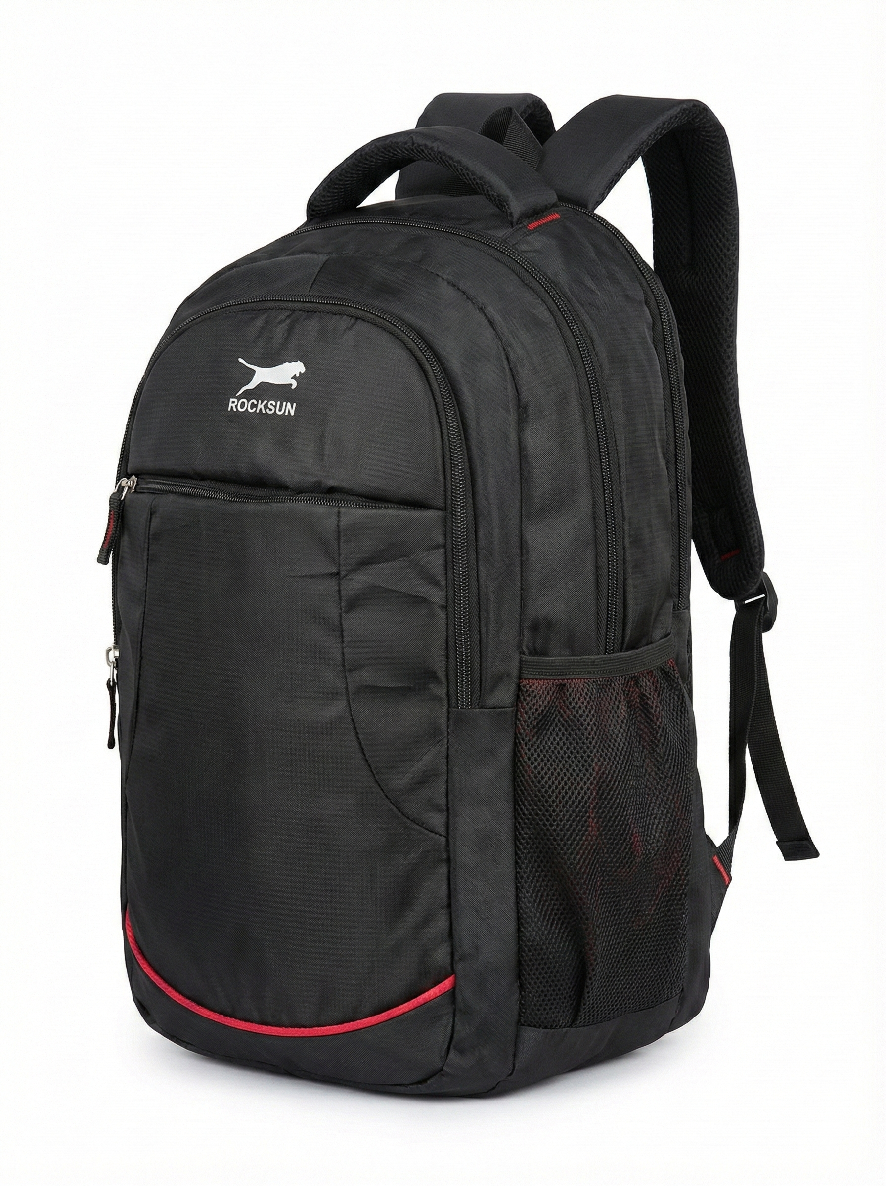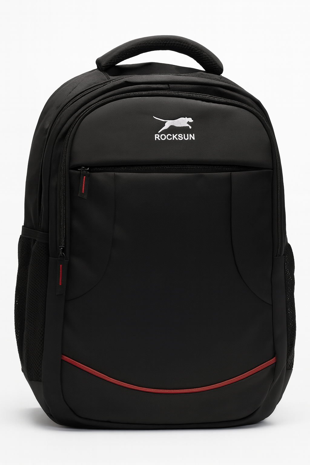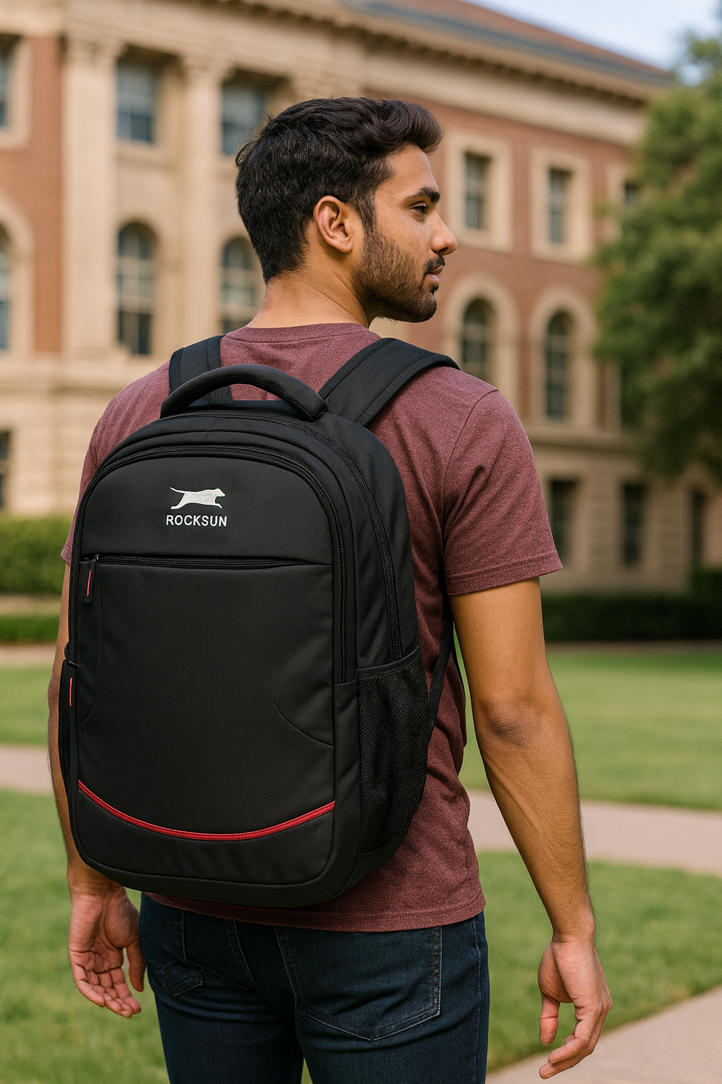 Introducing the **ROCKSUN Premium College & Laptop Backpack**, designed for students who want a perfect blend of style, durability, and comfort. Made with high-quality water-resistant fabric, this backpack ensures long-lasting performance even with daily use. The sleek black design with subtle red detailing gives it a modern and sporty look, suitable for college, school, coaching, travel, and everyday commuting.